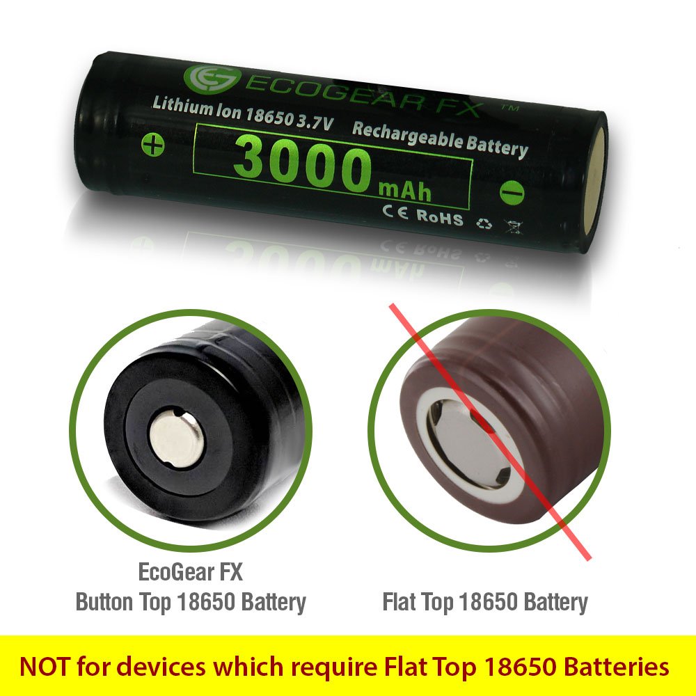 This is a complete Battery Kit which includes a battery charger with 2 charging bays, a 2-pack of 18650 button top batteries and a free battery storage case. The 18650 button top lithium-ion rechargeable batteries offer 3000mAh of power. The batteries offer low self-discharge and can be recharged up to 500 times. These 18650 batteries are a perfect choice for a high powered tactical flashlight or other low drain devices which require button top batteries. The battery charger has two separate charging slots, each of which charges and monitors a battery independently. Batteries can be charged simultaneously and the charger automatically detects the battery status and applies the appropriate charge mode. The chargers LED lights will display the batteries charging progress. Once charging is complete the charger will auto-stop. 18650 Batteries and ChargerCharger Specifications: • Charges 2 Batteries Simultaneously • Automatically Detects Battery Status and Selects the Appropriate Charge Mode • LED Lights Display Charging Progress • Auto-Stops Charging when Complete • Detachable Power Cord • Certified by RoHS, CE, FCC • Compatible with Batteries Li-ion: 18650, 17670, 18490, 17500, 17335, 16340 (RCR123), 14500, 10440 Ni-MH: AA, AAA Battery Specifications: • Capacity: Nominal: 3000mAh, Minimum: 2800 mAh • Internal PCB Protection: Prevents under-voltage at 2.5V and over-voltage at 4.25V • Nominal Voltage: Average 3.7V • Cut-off Voltage: 2.5V • Internal Impedance: less or equal to 180 milli-ohm (with PTC) • Cycle Performance: 90% of initial capacity at 400 cycles • Cycle life: > 500 cycles • Charge: Current = 0.5C (~1500mA) Voltage = 4.2 V End Current = 0.01 mA • Discharge: Current = 0.5C (~1500mA) End Voltage = 3.0V • Dimensions: Diameter: 18.5 mm, Length: 68.7 mm These batteries are NOT recommended for high-drain devices (i.e. Vaping Products).